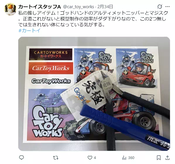 投稿はこんな感じでカートイワークスのステッカーといっしょに推しのアイテムを撮影してもらい、推しの理由なんかといっしょにハッシュタグ「#カートイ」を付けてでXでポストして下さい。