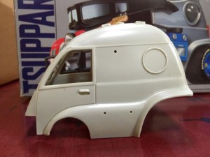 プラスチック製のボディは、プラモデルと同様に細部までリアルに作られていますがどうしてもラジコンのボディとしては、割れなど破損しやすく不向きでした。ポリカーボネイトと比べるとリアルさでは適いませんが、多少の接触でも破損することもなく、ガンガン走らせることが出来ます。ブラットはオフローダーですのでまさにぴったりの改良です。