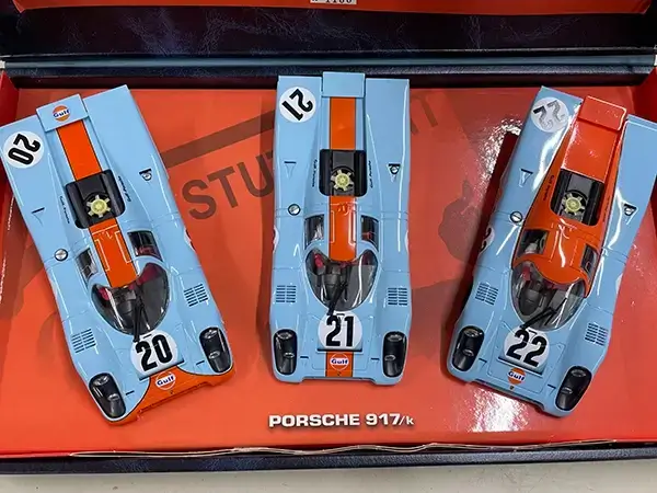 ポルシェが初めてル・マン 24時間耐久レースを制覇した 1970年に参戦したガルフチームのポルシェ917K、3台のスペシャルセット。優勝間違いなしと期待されたチームでしたが、この年のル・マンは 51台中完走が僅か 7台と非常に過酷なレース展開で残念ながら全車リタイヤとなってしまいました。