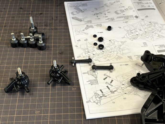 足回りの組立てももう少し、ここからは車体とタイヤを繋ぐ部分と、タイヤに動力を伝えるシャフトの組付けを行っていきます✊(説明書17~21)