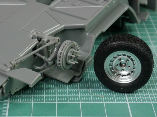このキット最大の難所で、ボディとシャシーを組むと実車に比べて腰高な上に、タイヤがフェンダーから飛び出します。
