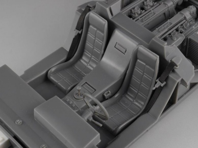 特徴としては、リヤトランクを除くすべての箇所が実車どおりに開閉可能。シャシーは、鋼管を鳥籠のように組んだフレーム構造や、幾多の細いアームで構成された足回りを再現。エンジンルームはハッチを開けたところから見える上半分だけ再現したいわゆる「上げ底」でなく完全再現で、それどころかミッションケース、排気管、ラジエーター、冷却管、イグニッションコイル、オイルフィルター等、完成後は見えない部分までほぼ全ての補機類も再現しています。