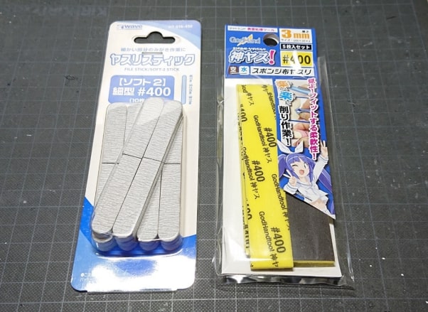 ホームセンターでも売っている通常の「耐水ペーパー(紙やすり)」の他に模型店では画像のような「スポンジタイプ」や「スティックタイプ」などの種類が増えスティックタイプは面を均一に削りたい時、スポンジタイプは曲面を削る時といった用途による使い分けが出来るようになりました。揃えておくと便利ですよ。