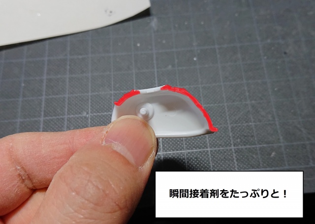 どこかの項目で「接着剤をハミ出さないように」と書きましたが今回の「合わせ目消し」の場合は、画像のようにパーツ同士合わさる面にたっぷり瞬間接着剤を付けて下さい。