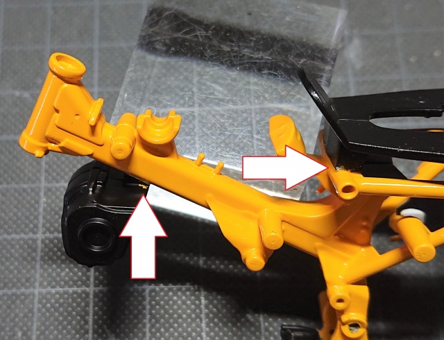本題はこれからで、早速塗分けの黒の指示がフレームにあります。これを筆塗りで行うか、マスキングして缶スプレーで行うかは作る人次第ですが今回は仕上げの良さを優先するので、マスキングをして缶スプレーで塗装することにします。