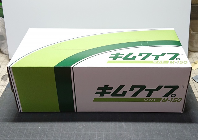キムワイプです。紙粉の少なさと吸収力が高く塗料の拭き取りなどで便利です。ホームセンター、模型屋さんでも取り扱っています。