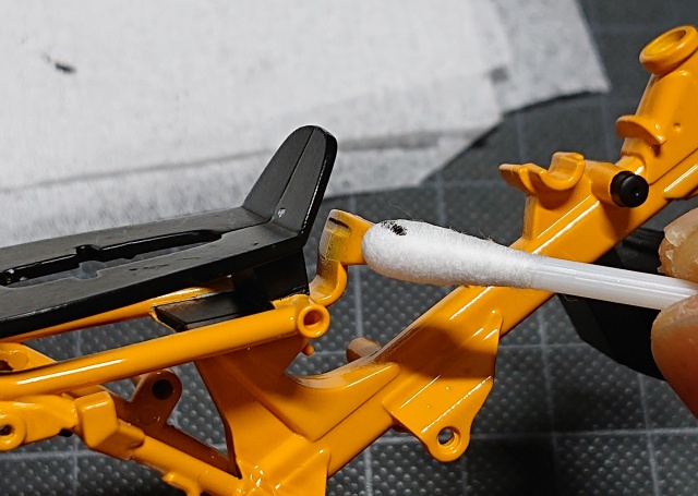 焦らずに修正していきましょう。漏れたイエロー塗料が塊で付着していた場合はヤスリなどで削って面を平らにしてから修正します。