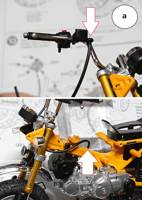 「a」の部分はフロントブレーキのオイルラインです。フレーム側の突起に上手くホースが入らなければ突起の塗膜部分を下地が出るまで削って対処してください。