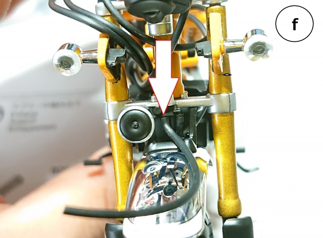 「e」はフロントブレーキのオイルラインのバイパス部分です。先にフロントのアンダーステム側の部分にホースを付けてから、その後にフレーム側に付けた方が、比較的楽だと思います。