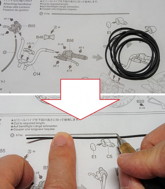 それぞれの配線の長さも、説明書内に実寸サイズで載っているのでそれを参考にしてキット付属のゴムホースをカットしてください。