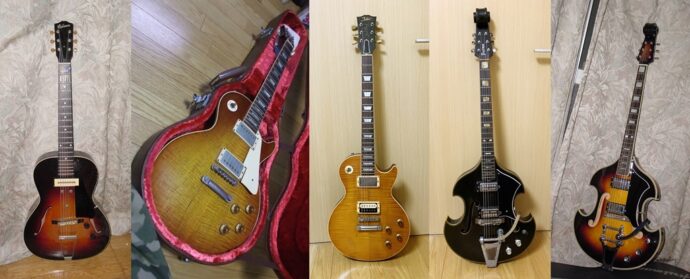 ギブソン レスポール・スタンダード はネックとボディだけのジャンクだったのをバブル崩壊後の閉店セールで購入。というか、救出。貴重なヴィンテージがジャンクなんて今じゃありえない。フレックがボディ全体にあるが、新品時は目立たなかったのかも。ジャンクのままの理由はこれかもしれない。一度現在のパーツでリストアして弾いたがすばらしい音だった。せっかくなので1950年代のパーツをコツコツと集めて交換中。